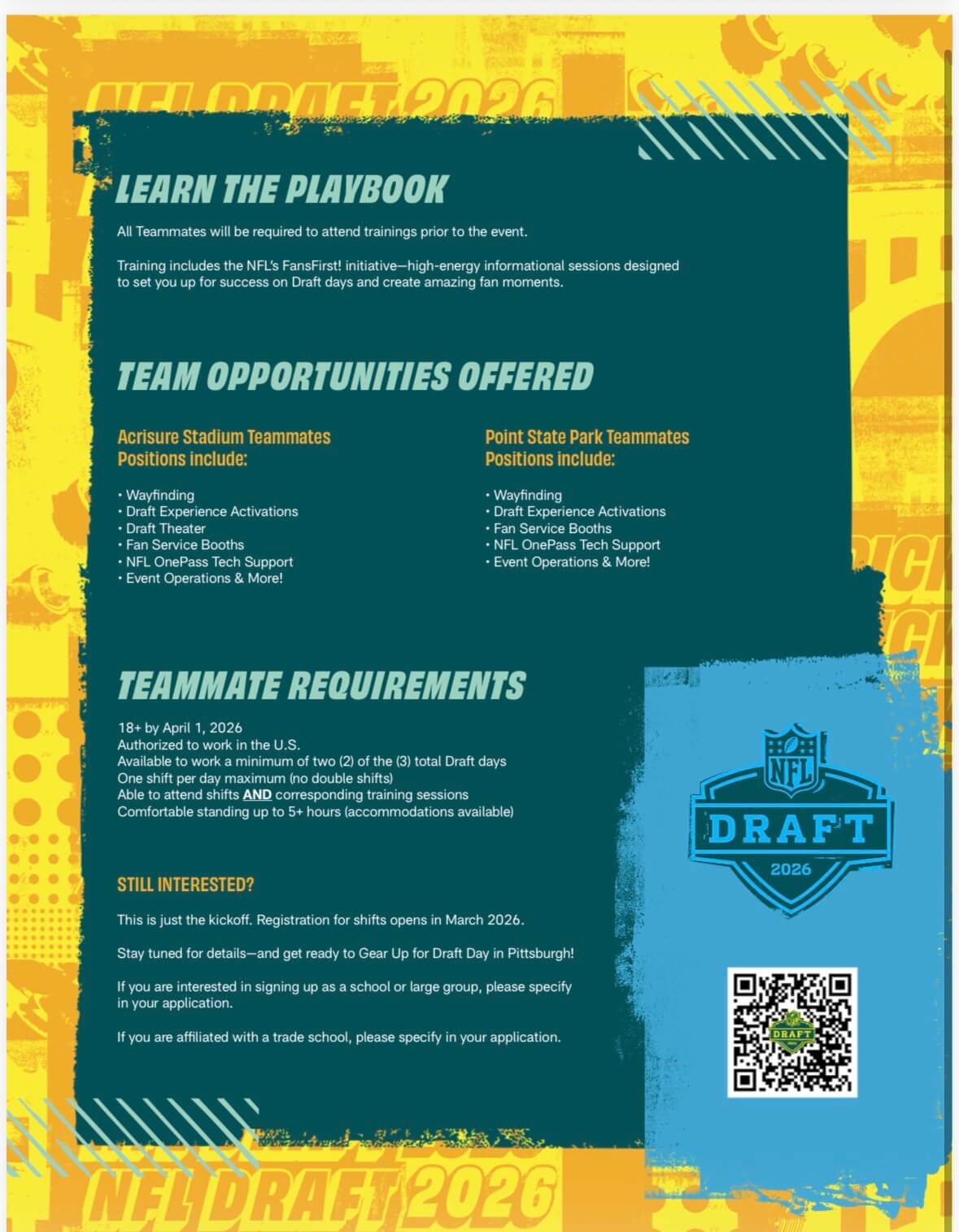 Please view the attached flyer for an exciting opportunity to be a part of the 2026 NFL Draft in Pittsburgh!