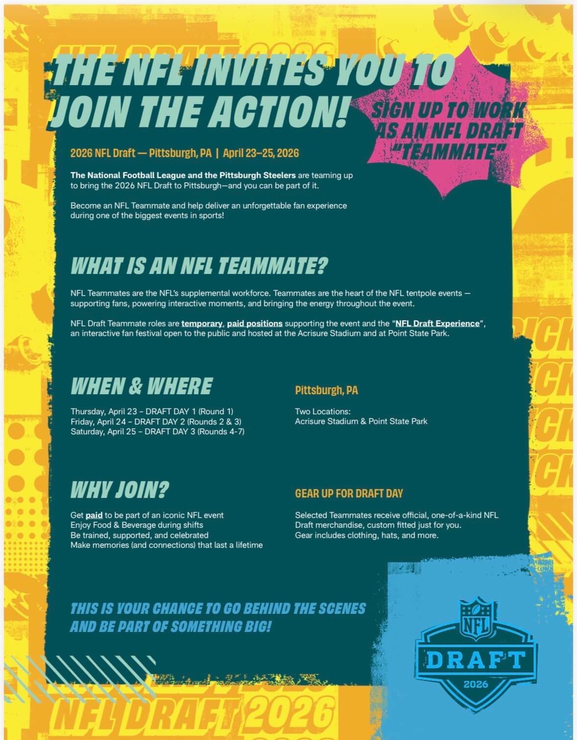 Please view the attached flyer for an exciting opportunity to be a part of the 2026 NFL Draft in Pittsburgh!